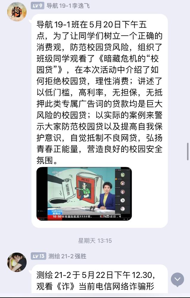 以班级为单位组织召开“学生资助诚信”主题教育班会,通过多样视频材料,普及征信知识和预防金融诈骗、电信诈骗和不良网贷等方面的知识,强调诚信借贷、诚信考试、诚信就业等的重要性,引导学生提高征信意识、金融安全防范意识,倡导新时代大学生应恪守“诚信为本”。同时,积极建设诚信个人、诚信宿舍、诚信班级,让诚信之风吹进每位同学心中。