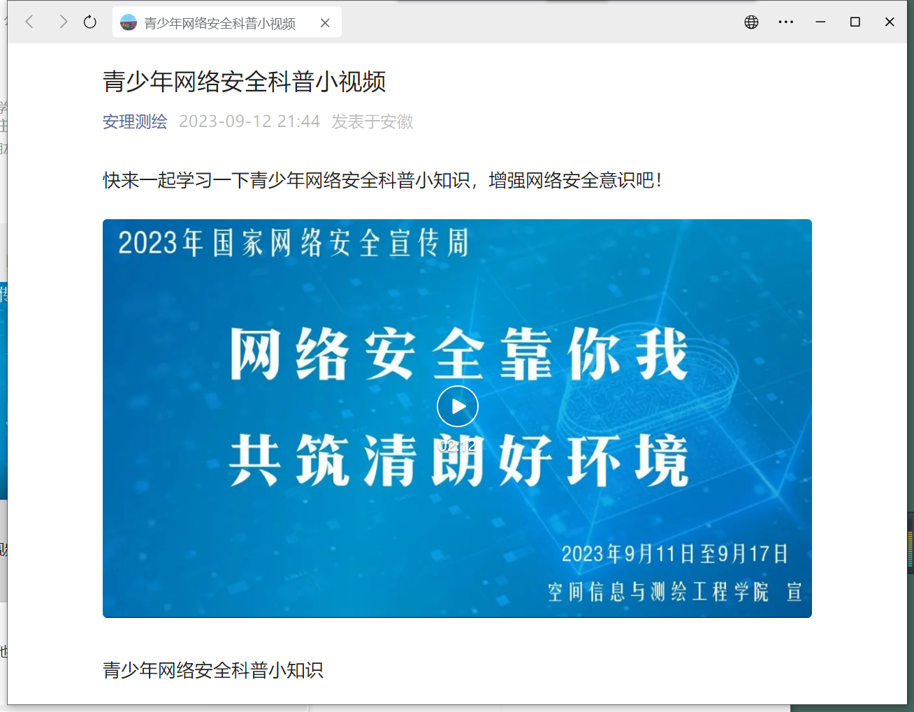 团委新媒体中心、易班工作室以网络安全为主题制作宣传视频、宣传海报,利用微信平台、易班平台等融媒体平台推送《新时代青少年网络文明公约》《青少年网络安全科普小视频》等内容。